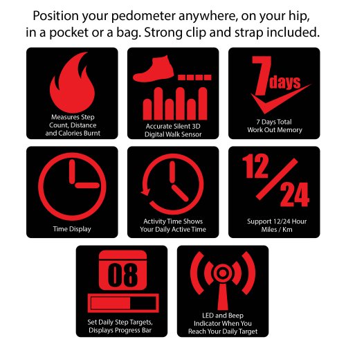 Measure the daily steps taken, count calories burned, track distance walked in miles or kilometres. Plus Activity Time shows your daily active time while walking. Includes an automatic 7 day memory so you can keep motivated and track your progress. The pedometer also automatically resets at midnight so you can easily track your daily steps, distance and activity.