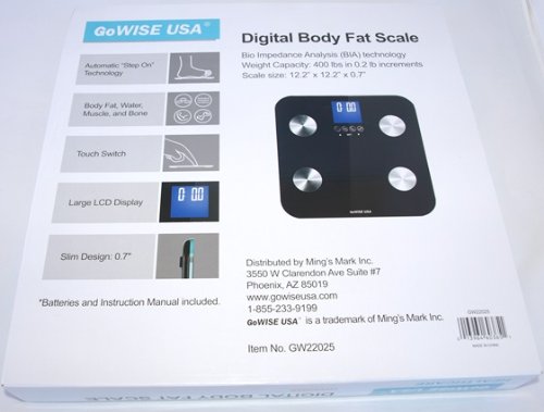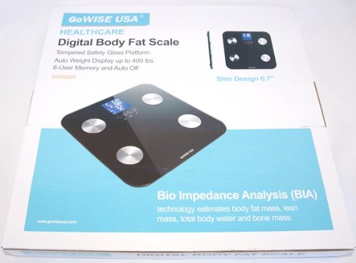 This GoWISE USA Body Fat scale measures four components of the body: body fat, water, bone mass, and muscle mass. It is equipped with sensors on a tempered glass platform. This scale uses a measurement method called Bioelectrical Impedance Analysis (BIA). This type of technology uses a minute electrical current and passes it through the body to estimate the measurements of each component. It can store information for 8 users. This Body Fat scale has an Auto-On function, LCD backlight, a touch switch, a weight capacity of 400 lbs., and an athlete mode. Athlete mode uses additional software to calculate accurate results for highly active individuals. It is powered by (2) CR2032 lithium batteries (included).