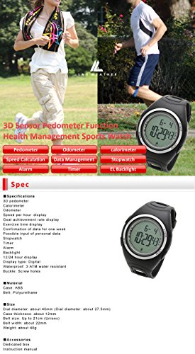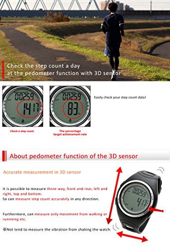 • [Function] Pedometer, calorie consumption display, Odometer, hour display, goal achievement rate display, exercise time display, check the data for one week, can input personal data, stopwatch, timer, alarm, backlight, 12/24 display switching time [Material] Case: ABS belt: polyurethane