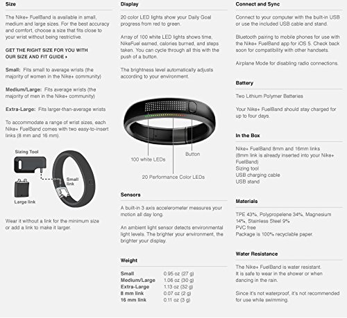 Nike+ FuelBand tracks your activity through a sport-tested accelerometer, then translates every move into NikeFuel. It's also a great watch. Nike+ FuelBand tracks running, walking, dancing, basketball and dozens of everyday activities. How active do you want to be? Set your Daily Goal and Nike+ FuelBand tracks your progress, lighting up from red to green throughout the day. Get to green and you've hit your goal. With the touch of a button you can cycle through your time, NikeFuel earned, steps taken and calories burned. Challenge yourself to capture records, reach new milestones and unlock special achievements. Go on a streak by seeing how many days in a row you can get to green. Wirelessly sync your Nike+ FuelBand to visualize your results. Or plug it directly into your computer's USB port to sync. See your peaks, your progress and your trophies. Get the free Nike+ FuelBand mobile app to sync wirelessly, track your progress and get extra motivation on the go. With the app you can compete with yourself or share results with your friends to compare, compete and celebrate. To accommodate a range of wrist sizes, each Nike+ FuelBand comes with two easy-to-insert links (8 mm and 16 mm). Wear it without the inserts for the minimum size or add a link to make it larger.