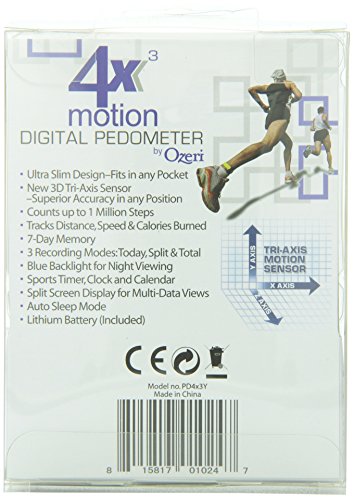 Introducing the 4x3motion Digital Pedometer by Ozeri - the world's most advanced 3D pedometer. Unlike other pedometers that do not work accurately unless placed vertically, the 4x3motion Digital Pedometer utilizes the latest generation in Tri-Axis technology to provide superior accuracy in any position, whether up, down, flat, on its side, or at any angle. Moreover, the 4x3motion Digital Pedometer utilizes a Digital 3D Acceleration Sensor which is far more accurate than mechanical sensors used in other pedometers. Compact, sleek and ultra slim, the 4x3motion Digital Pedometer fits is any pocket and is the ultimate personal trainer. Used by professional 100 mile ultra runners such as Evan Kimber, the 4x3motion Digital Pedometer records your steps, distance, average speed, calories burned, and time spent exercising, and displays your data on a new bright LCD with a night view backlight. The 4x3motion Digital Pedometer filters out vibrations and only begins counting after it detects a sequence of continuous steps for greater accuracy. The 4x3motion Digital Pedometer ships with a Lithium battery, a bonus strap and instruction manual. Your satisfaction is 100% guaranteed.